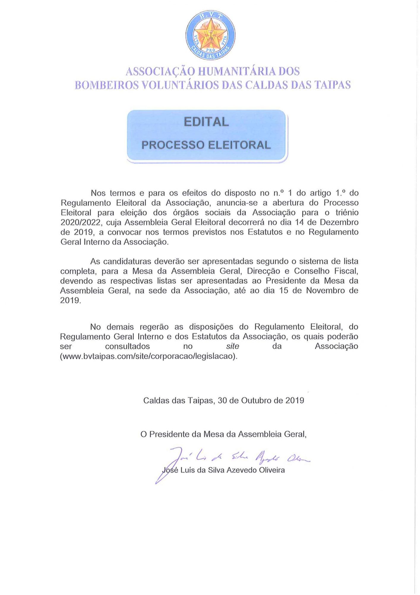 B.V.Taipas 30/10/201930/10/2019 Destaque No Comments NOTA: Carregar sobre a imagem para ver texto em PDF. EDITAL – PROCESSO ELEITORAL